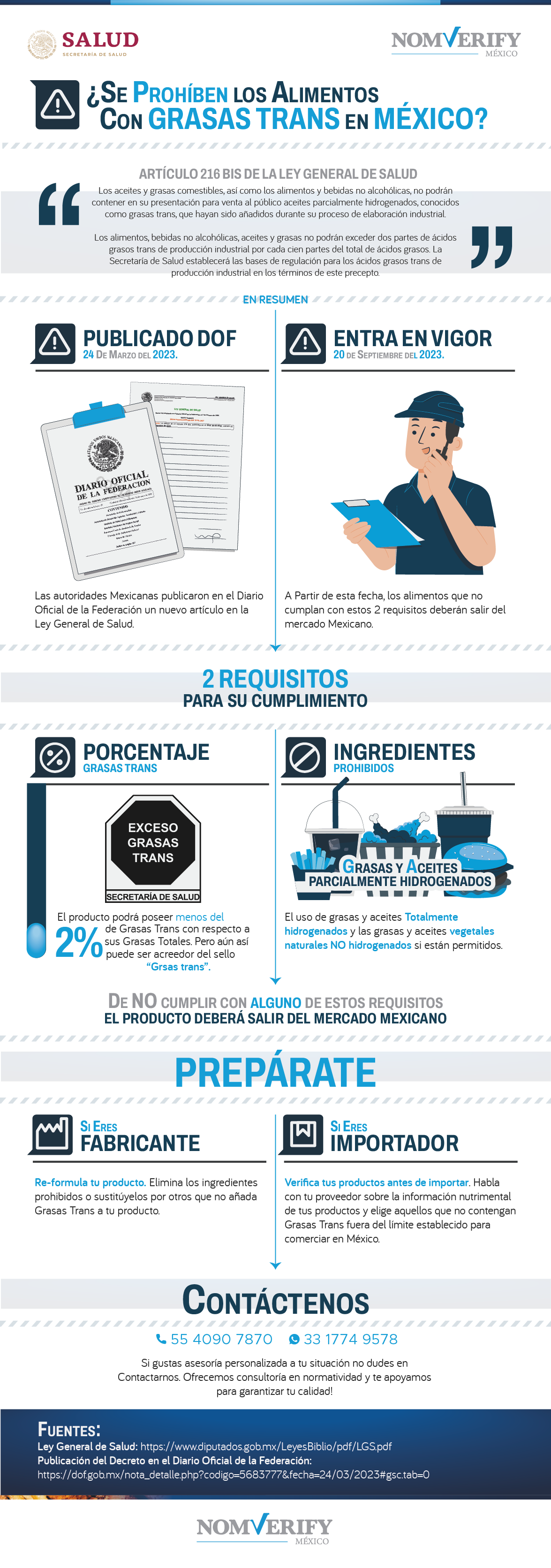 El pasado 24 de Marzo del 2023 se publicó en el Diario Oficial de la Federación una actualización a la Ley General de Salud. Un decreto que será necesario cumplir y en el que prohíbe hasta cierto punto la aparición de Grasas Trans en productos para consumo mexicano. El artículo 216 Bis de la ley General de Salud menciona que: