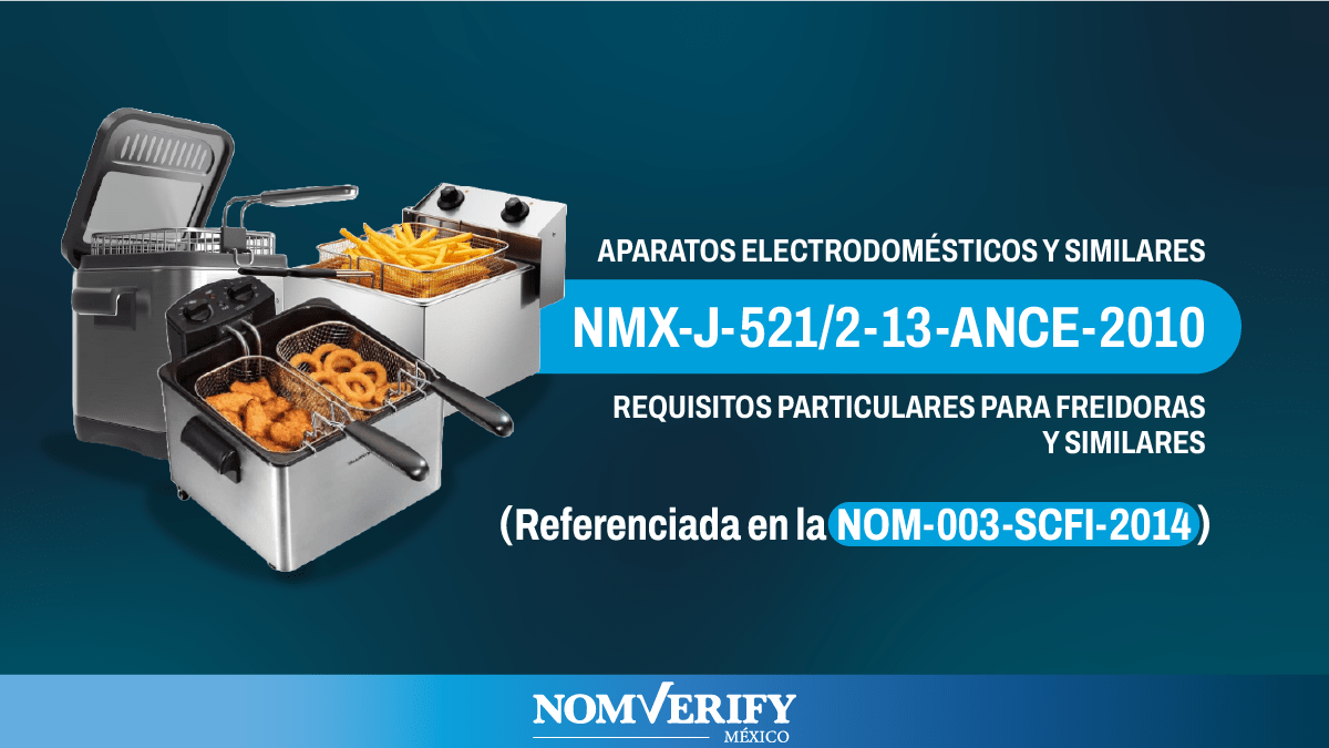 La NMX-J-521/2-13-ANCE-2010, es una Norma Mexicana, referenciada en la NOM-003-SCFI-2014 que especifica requisitos de seguridad para freidoras eléctricas, sartenes para freír, sartenes tipo wok y otros aparatos en los cuales se utiliza aceite comestible para cocción.