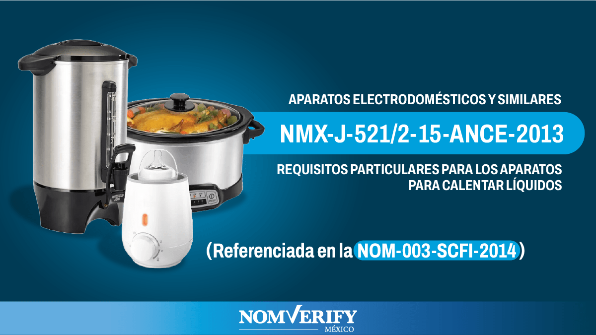 La NMX-J-521/2-15-ANCE-2013, que se encuentra referenciada en la NOM-003-SCFI-2014, específica las características de seguridad para los aparatos eléctricos que se utilizan para calentar líquidos de uso doméstico y propósitos similares, cuya tensión asignada no es mayor que 250 V.